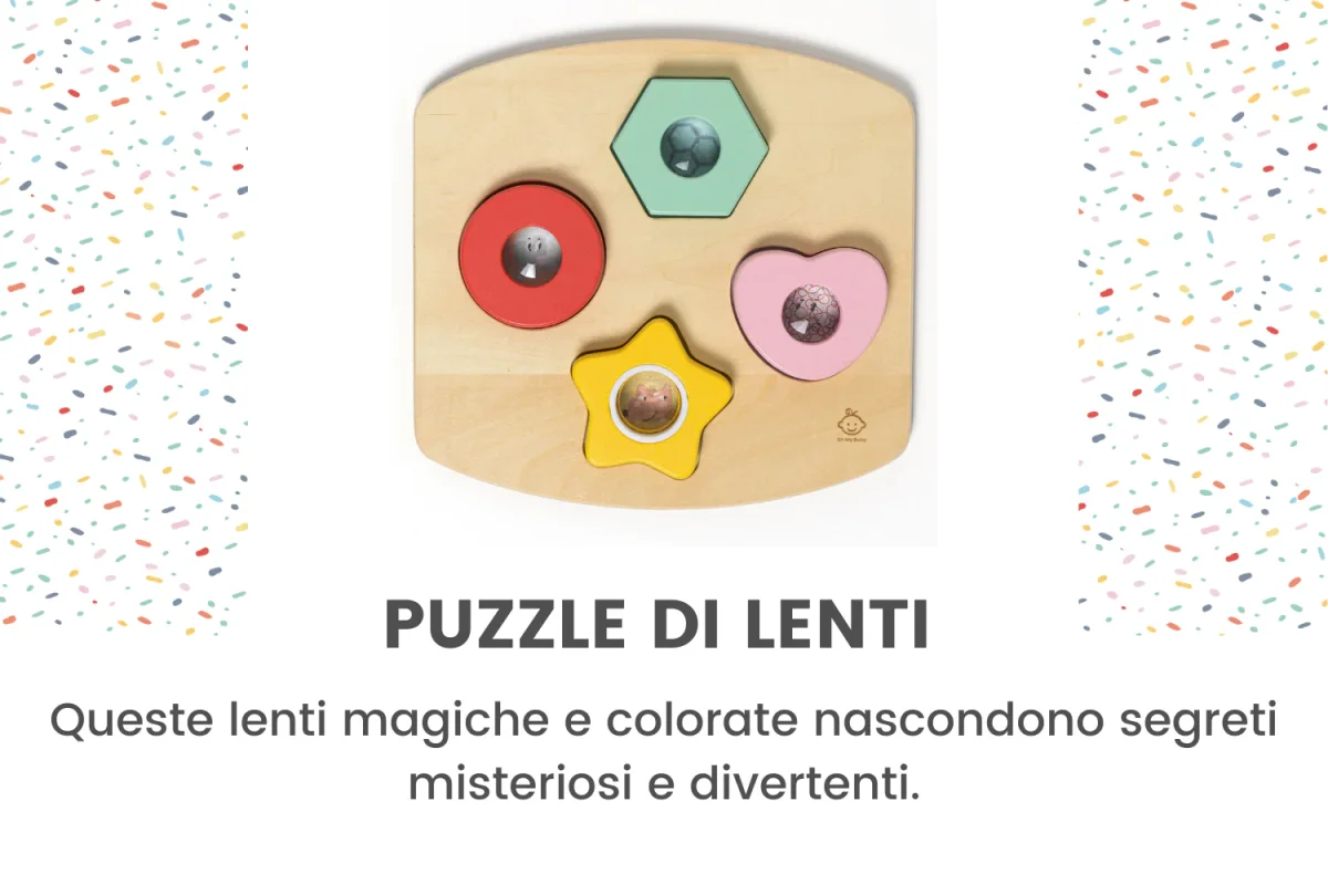 Puzzle di lentiQueste lenti magiche e colorate nascondono segreti misteriosi e divertenti. Il tuo piccolo li scoprirà guardando attraverso le lenti magiche e scoprendo i segreti che nascondono.