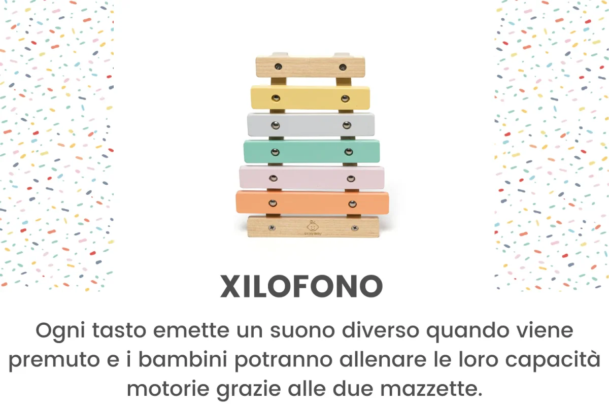 XilofonoQuesto xilofono emette cinque suoni diversi ed è perfetto per introdurre i bambini a nuovi suoni e colori. Ogni tasto emette un suono diverso quando viene premuto e i bambini potranno allenare le loro capacità motorie grazie alle due mazzette.