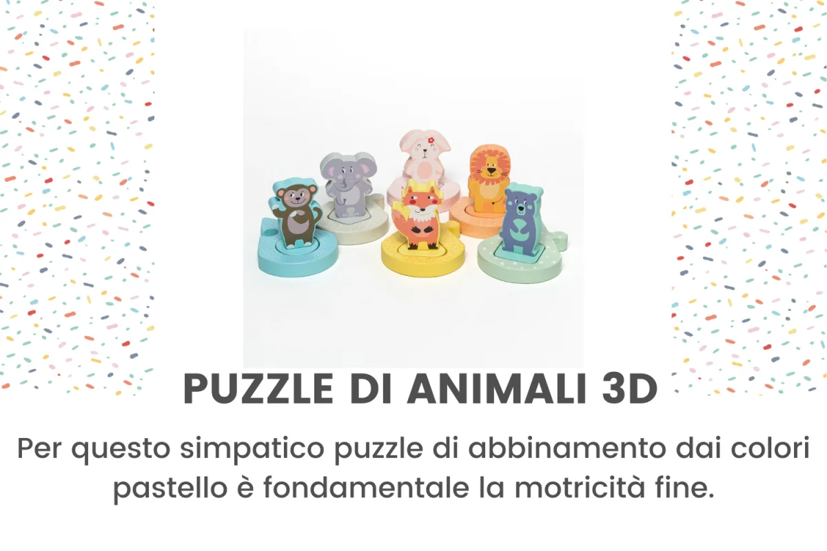 Puzzle di animali 3DPer questo simpatico puzzle di abbinamento dai colori pastello è fondamentale la motricità fine.