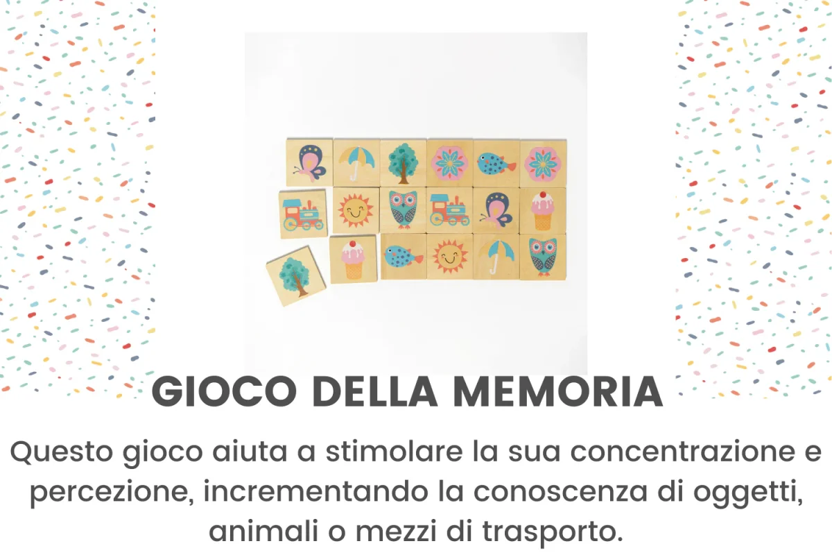 Gioco della memoriaIl tuo piccolo si trova in una fase in cui lo sviluppo cognitivo e la memoria acquisiscono un ruolo importante. Questo gioco aiuta a stimolare la sua concentrazione e percezione, incrementando la conoscenza di oggetti, animali o mezzi di trasporto e sviluppando il linguaggio orale.