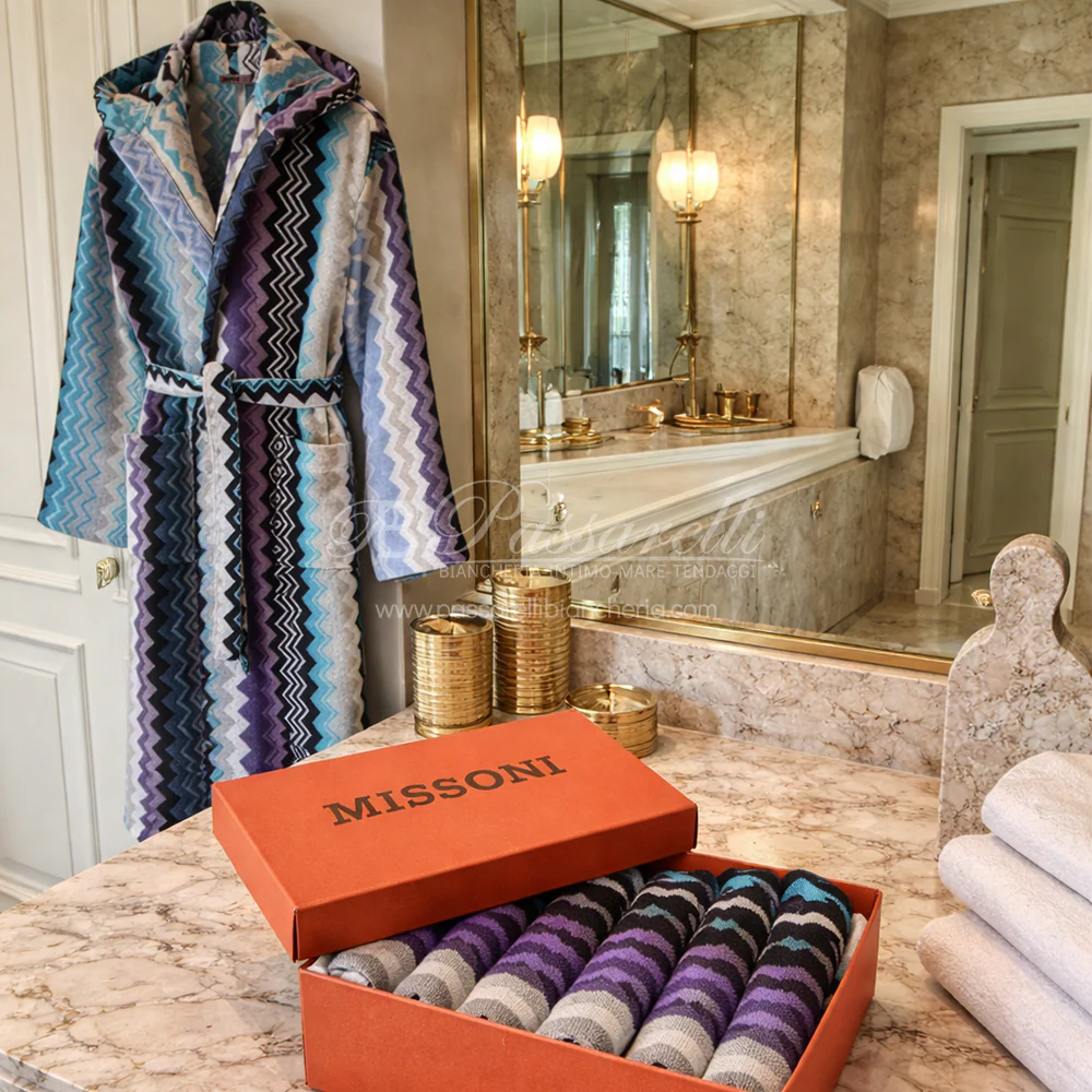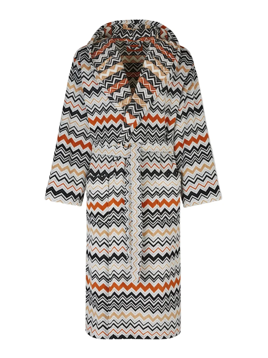 Vivaci e confortevoli, gli accappatoi Spugna Jacquard con cappuccio di Riviera sono realizzati in soffice cotone di 400 grammi al metro quadrato.